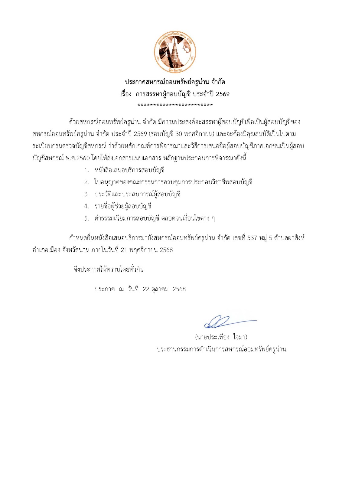 ประกาศสหกรณ์ออมทรัพย์ครูน่าน จำกัด เรื่อง การสรรหาผู้สอบบัญชี ประจำปี 2569