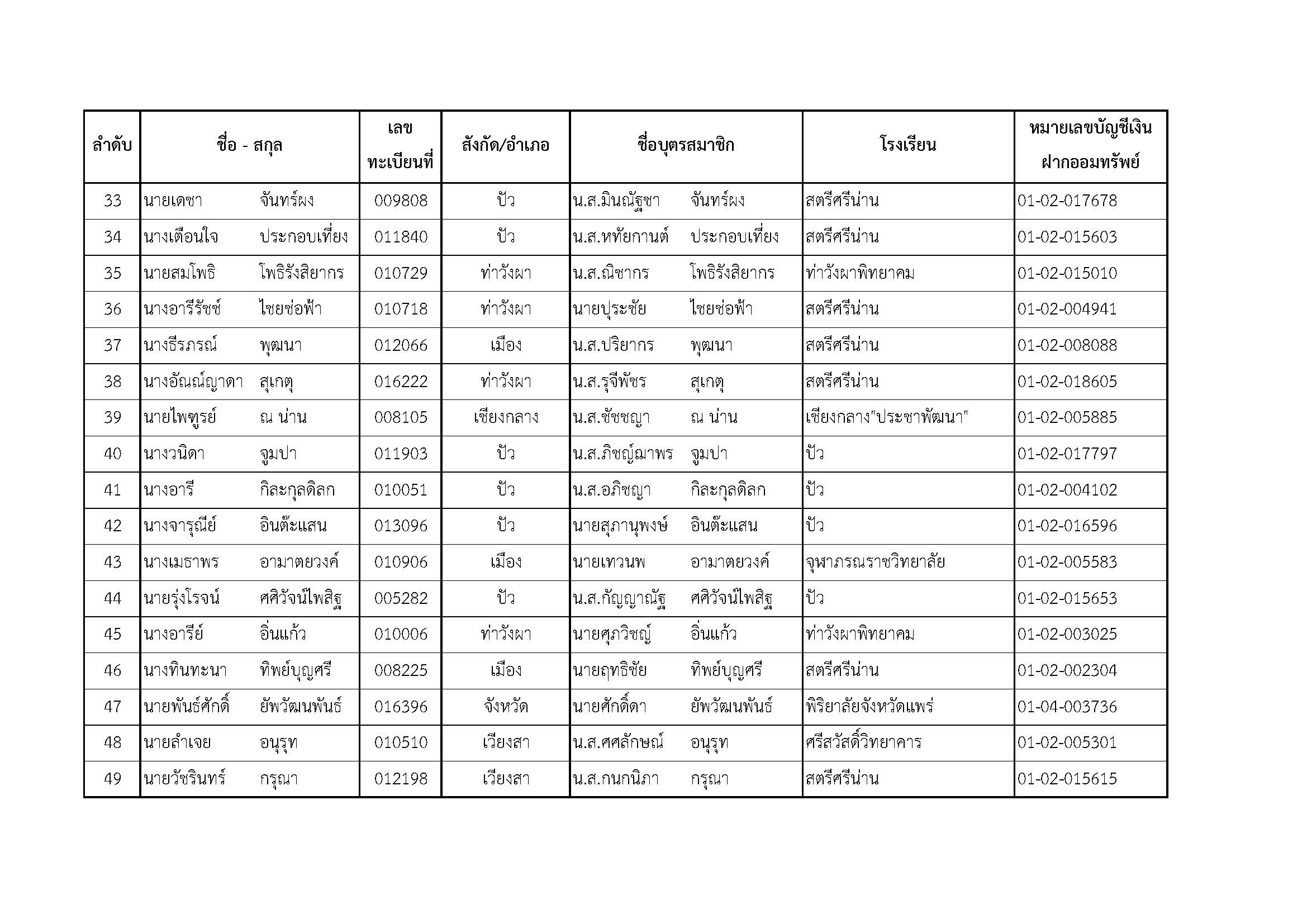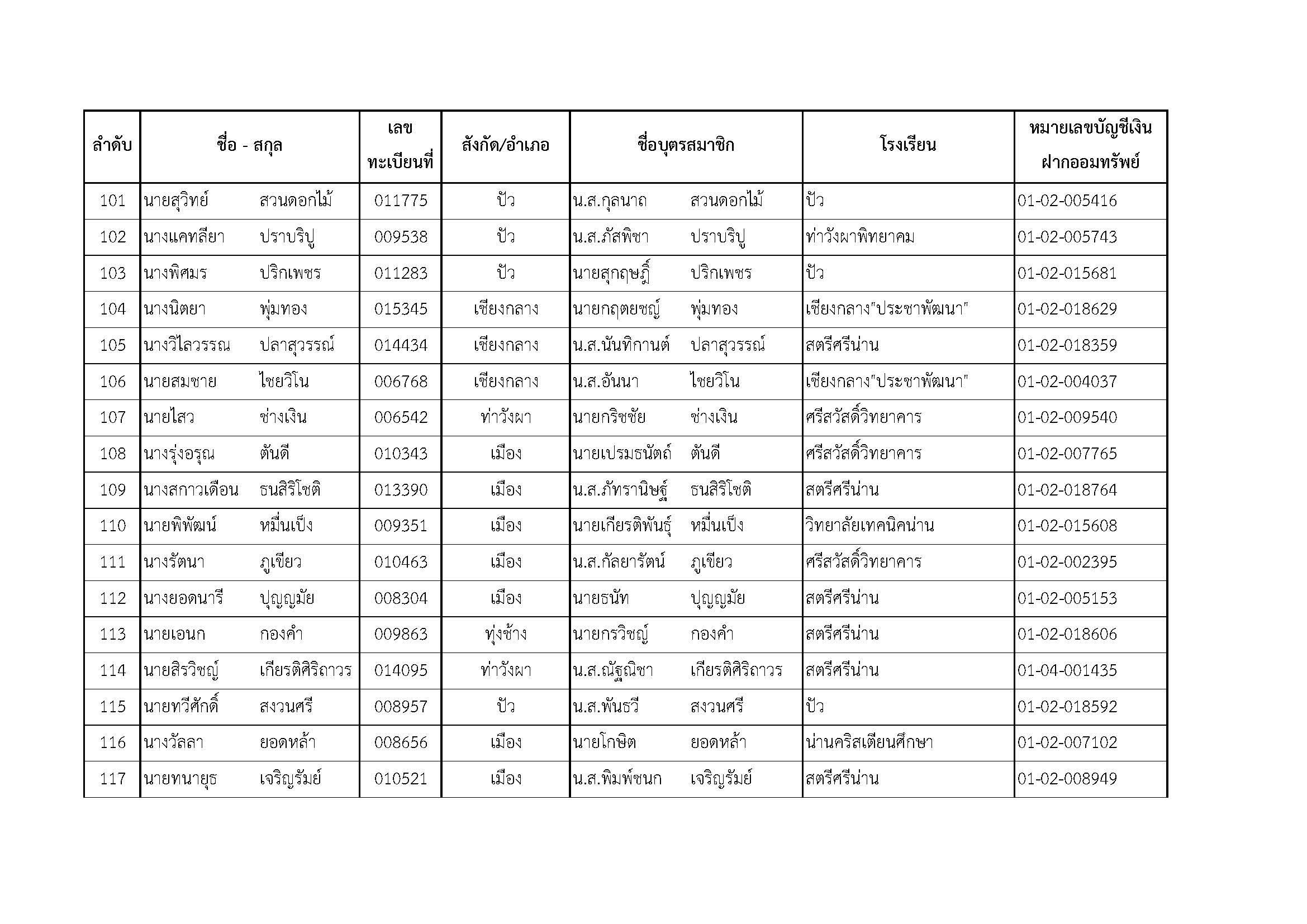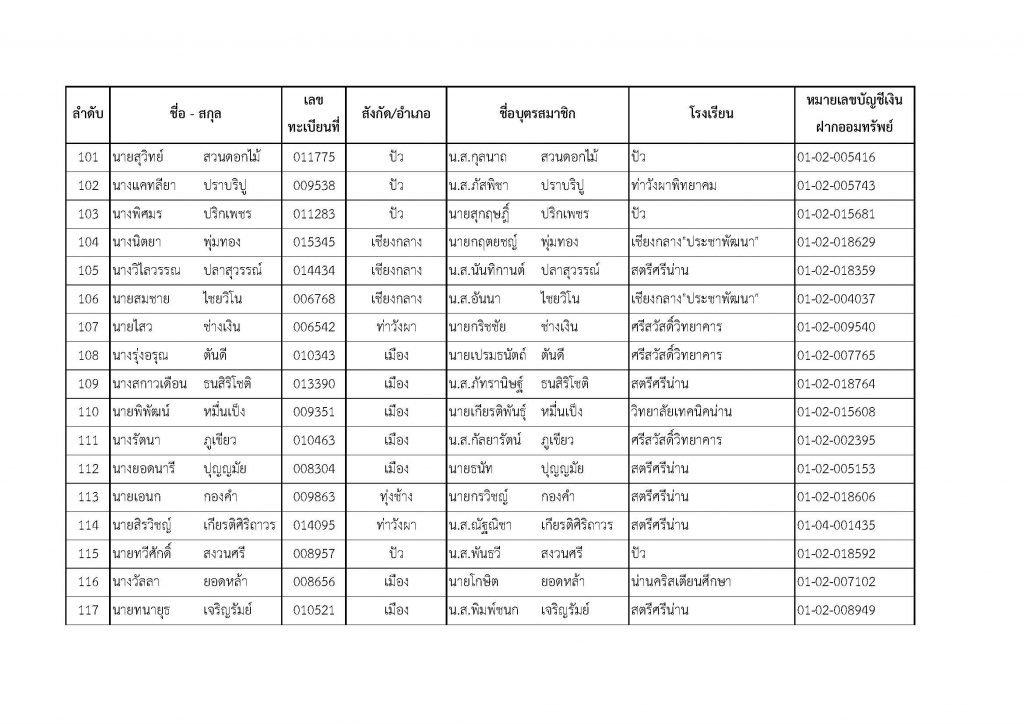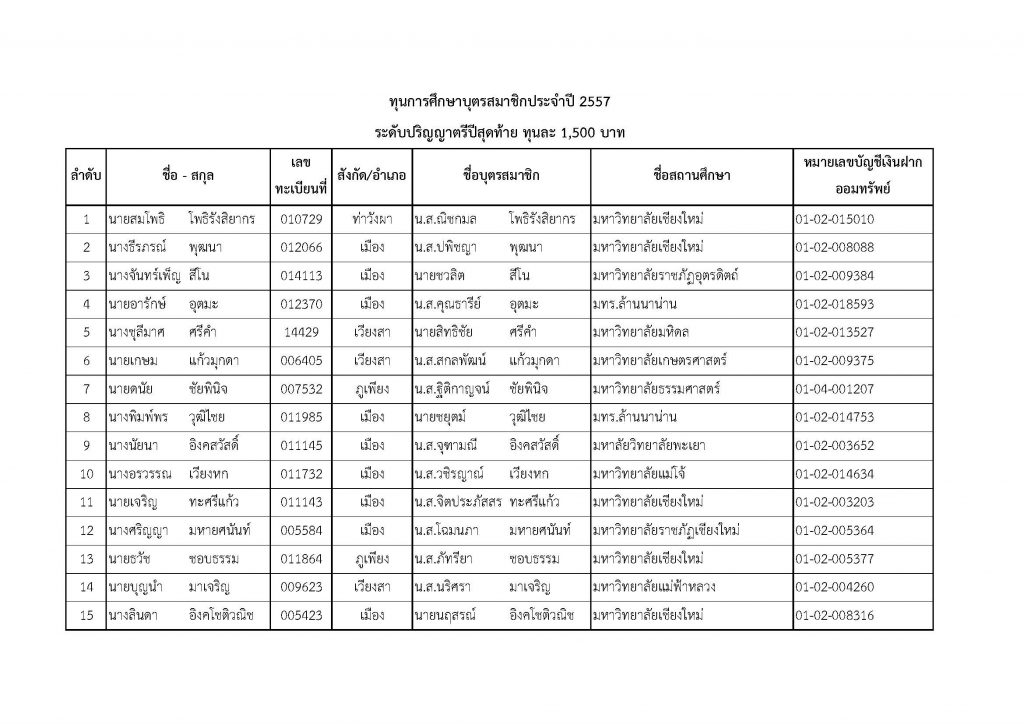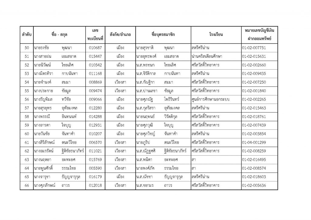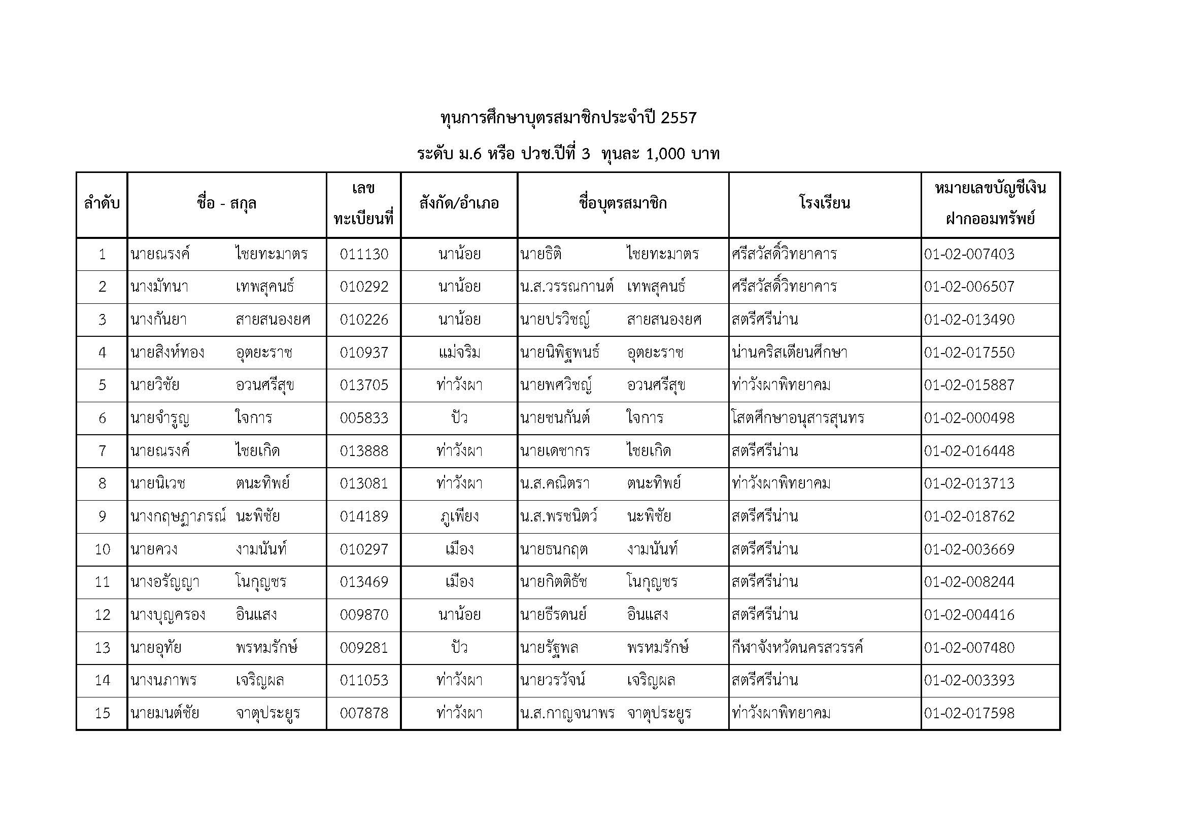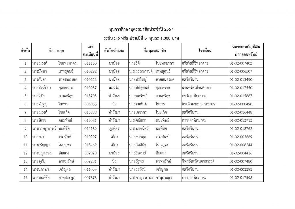 ที่ประชุมคณะกรรมการดำเนินกาสหกรณ์ออมทรัพย์ครูน่าน จำกัด ได้มีมติอนุมัติจ่ายทุนสวัสดิการส่งเสริมการศึกษาบุตรสมาชิกประจำปี 2557 โดยได้โอนเงินเข้าบัญชีเงินฝากของสมาชิก สมาชิกสามารถตรวจสอบข้อมูลได้ตามรายชื่อด้านล่าง ตั้งแต่วันนี้เป็นต้นไป
