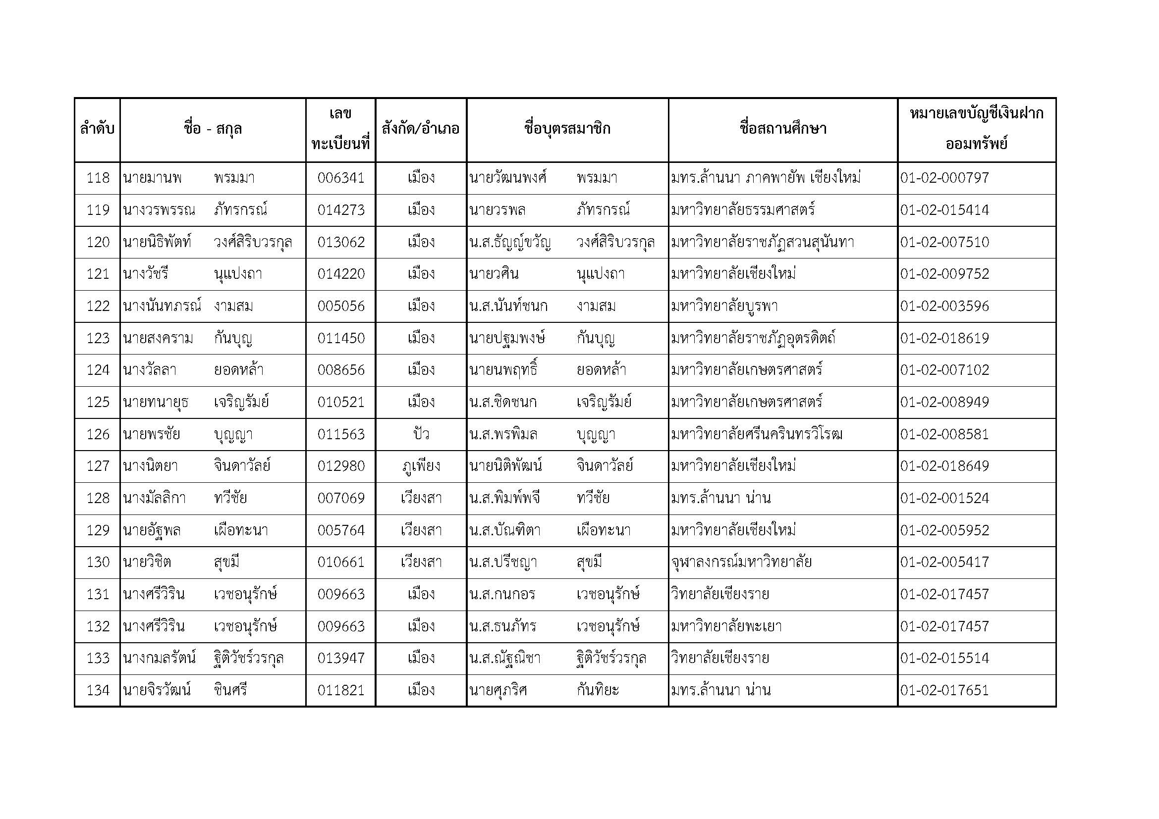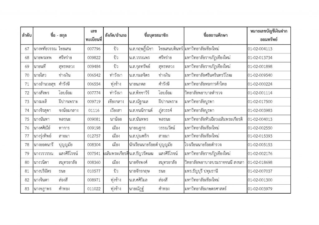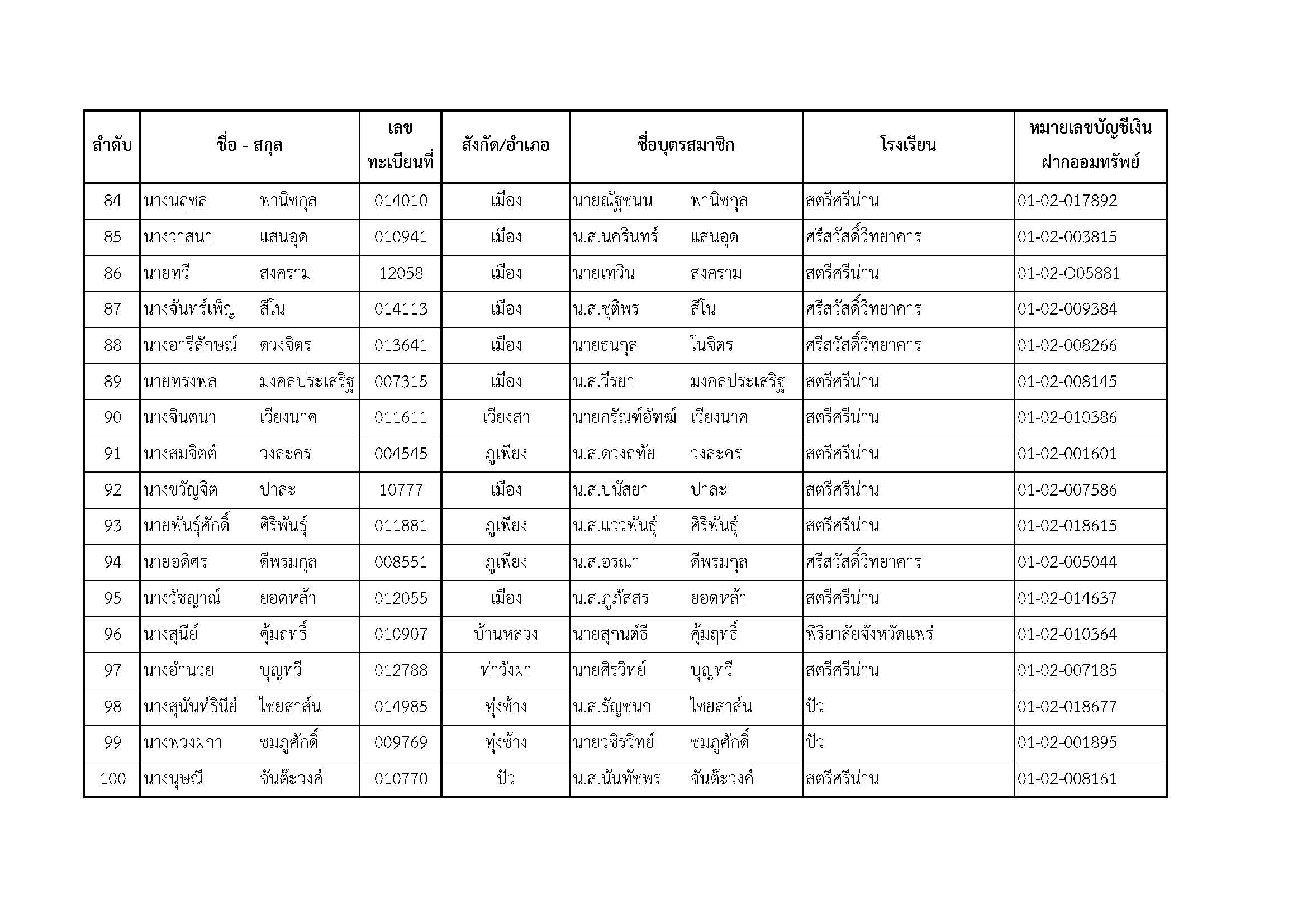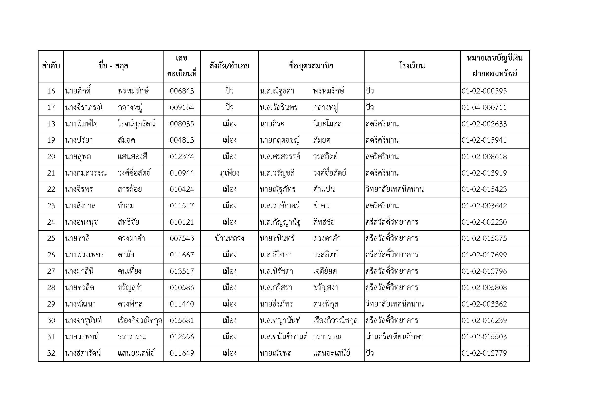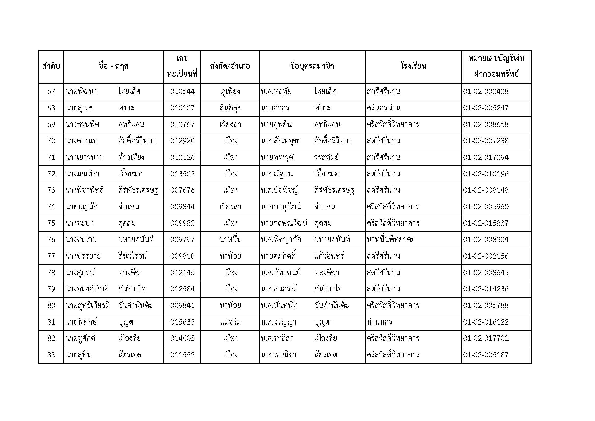 ที่ประชุมคณะกรรมการดำเนินกาสหกรณ์ออมทรัพย์ครูน่าน จำกัด ได้มีมติอนุมัติจ่ายทุนสวัสดิการส่งเสริมการศึกษาบุตรสมาชิกประจำปี 2557 โดยได้โอนเงินเข้าบัญชีเงินฝากของสมาชิก สมาชิกสามารถตรวจสอบข้อมูลได้ตามรายชื่อด้านล่าง ตั้งแต่วันนี้เป็นต้นไป
