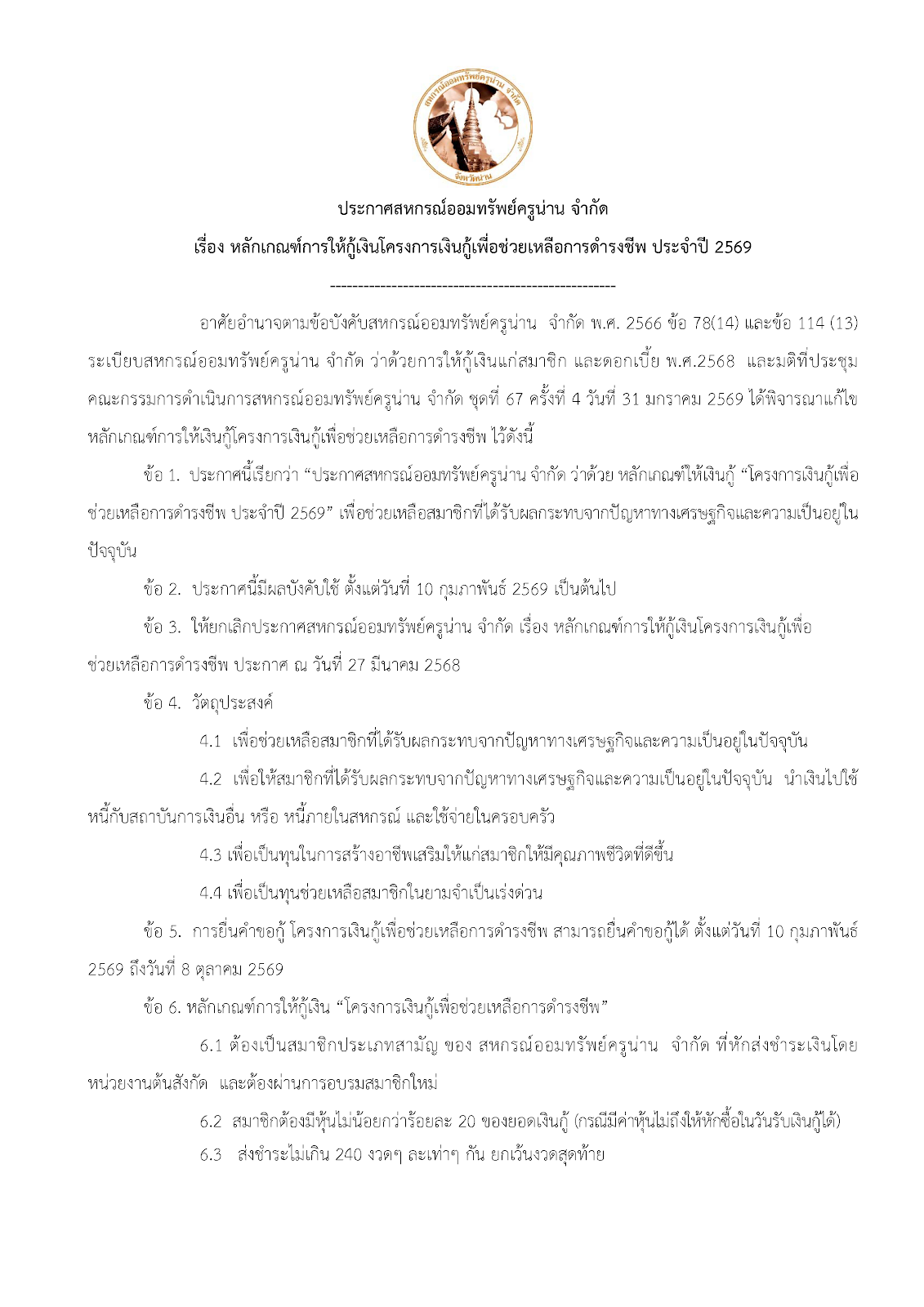 ประกาศสหกรณ์ออมทรัพย์ครูน่าน จำกัด เรื่อง หลักเกณฑ์การให้กู้เงินโครงการเงินกู้เพื่อช่วยเหลือการดำรงชีพ ประจำปี 2569
